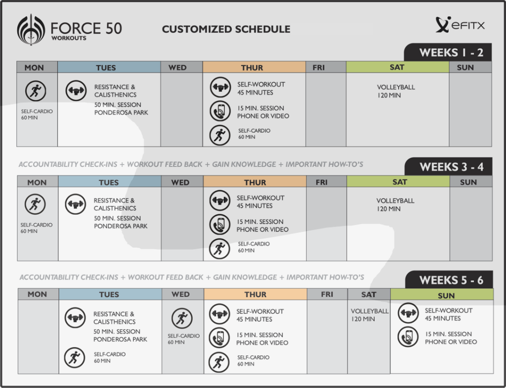 15 MINUTE WEEKLY CONSULTATION -This is a scheduled phone call or optional video session. Many clients have better consistency with the program when there is an appointment to hold them accountable. This can be referred as a Accountability Check-In. This meeting is to gather client feedback and to make any necessary adjustments to the upcoming workout. This time can be utilized to discuss fitness topics or learn how to use features of the EfitX app. Furthermore, it designates undivided attention between client and coach. Coaches may become busy during the week and may have difficulty responding to text messages.