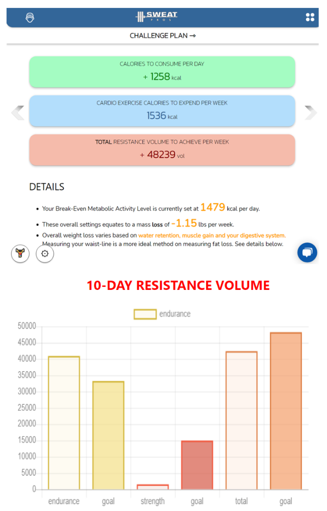 The second screen displays the 10-Day progress of where the client stands in all categories. It is the coaches task to adjust each level setting to optimize the client`s program. Metabolic Activity Level is a new type of measurement to monitor how the body changes based on calories consumption, energy expenditure thus the factors which change metabolism.